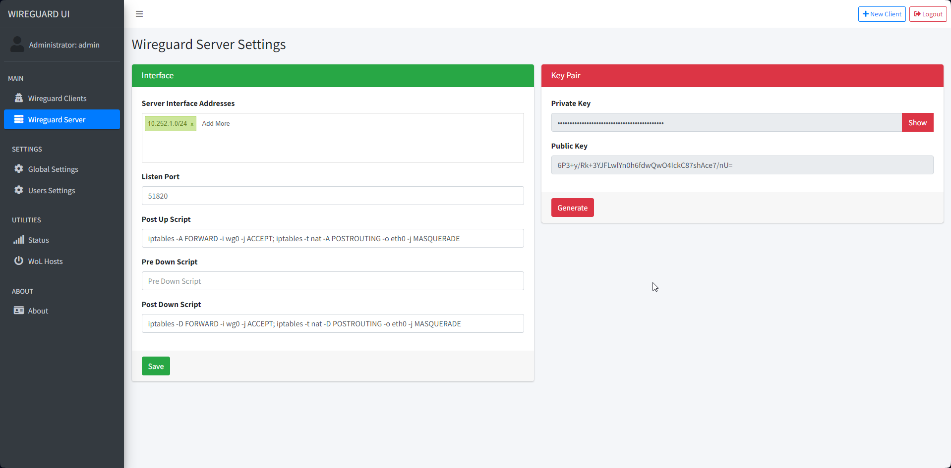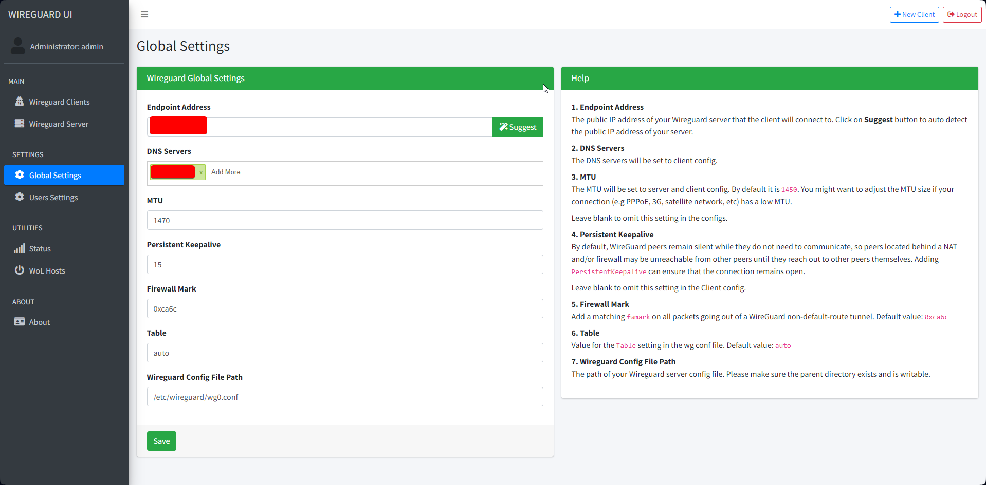 To configure the settings in the WireGuard UI panel, refer to the images below: